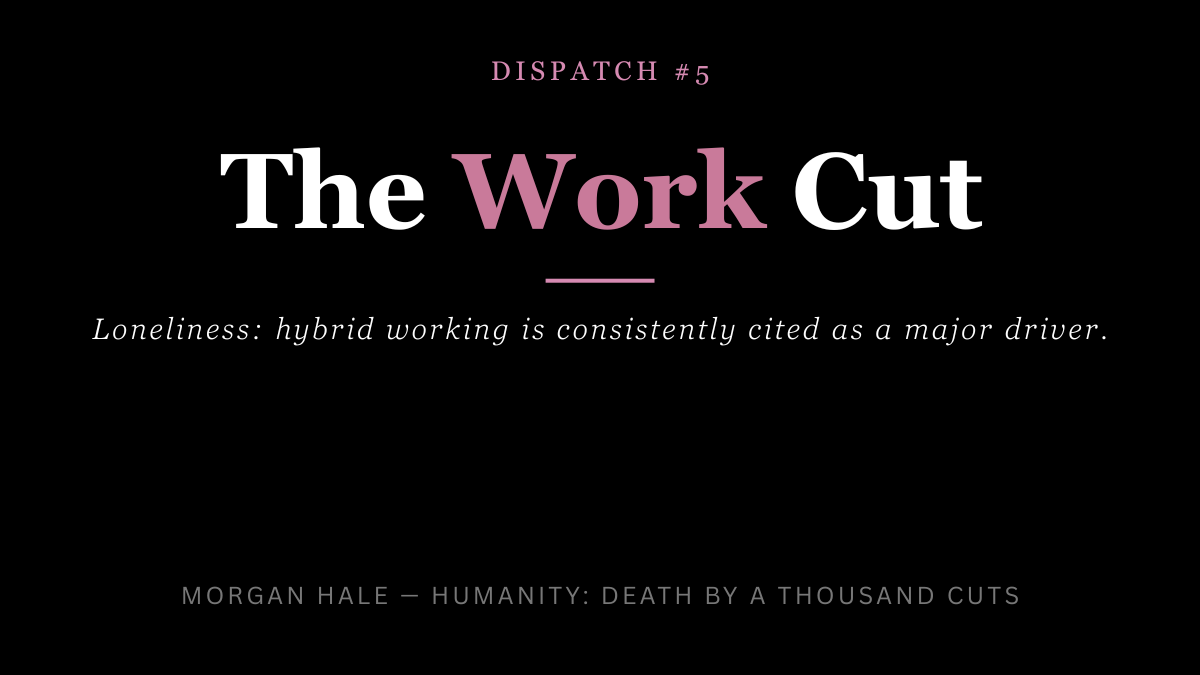 Remote work started as an emergency measure. It was normalised because the metrics that mattered to employers — productivity, cost, commute time — held steady or improved. What those metrics did not capture was what was lost: the accidental conversation, the corridor disagreement that got resolved, the lunch table where people who had not chosen each other’s company nonetheless had to navigate each other.^[3]